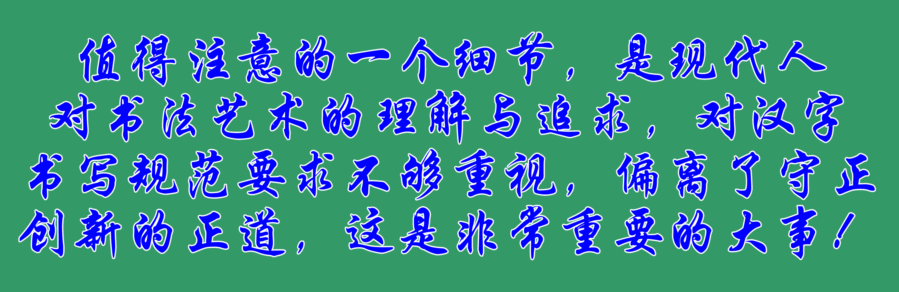 值得注意的一個(gè)細(xì)節(jié),是現(xiàn)代人對(duì)書法藝術(shù)的理解與追求,對(duì)漢字書寫規(guī)范要求不夠重視,偏離了守正創(chuàng)新的正道,這是非常重要的大事!所謂創(chuàng)新,必須以正楷為根為魂,而不是歪歪扭扭的作態(tài),還美其名曰這個(gè)體,那個(gè)體,實(shí)際是經(jīng)不起歷史考驗(yàn)的隨便體而已!