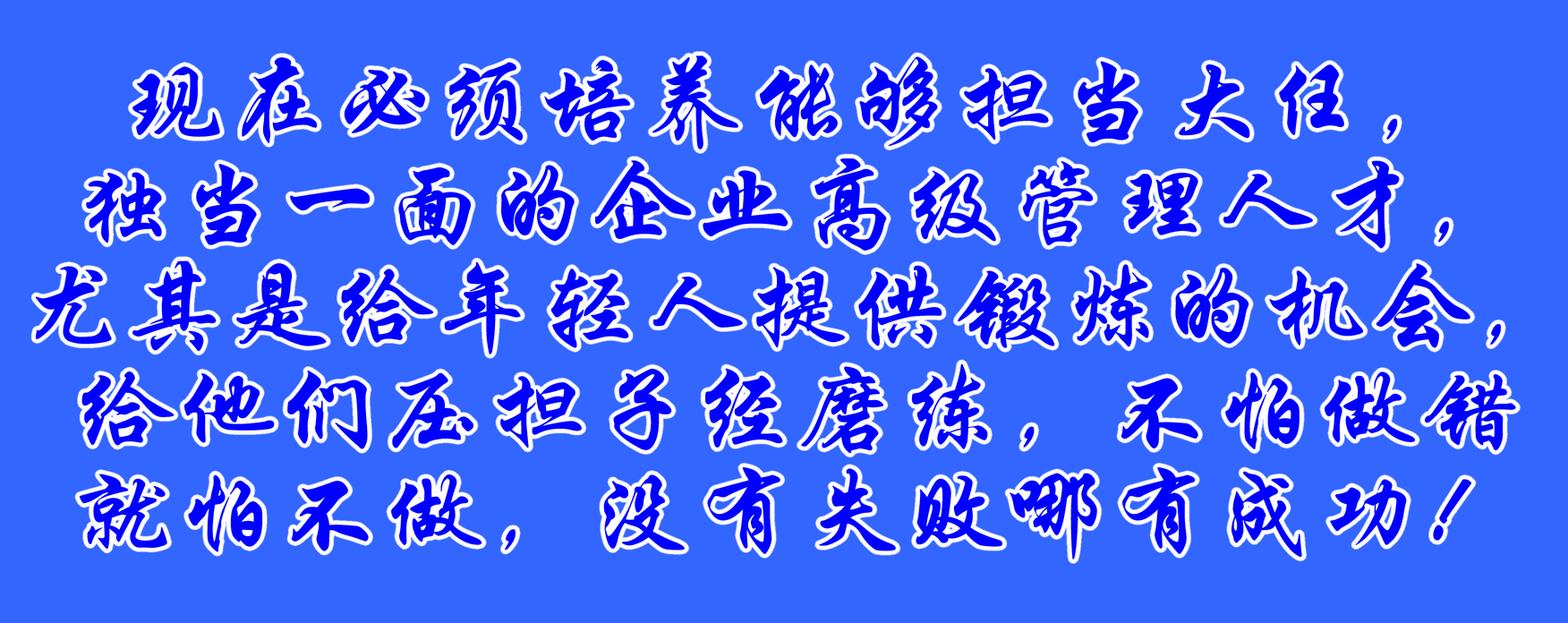 我對(duì)公司未來(lái)的重要人事,提出了建設(shè)性意見(jiàn),現(xiàn)在必須培養(yǎng)能夠擔(dān)當(dāng)大任,獨(dú)當(dāng)一面的企業(yè)高級(jí)管理人才,尤其是給年輕人提供鍛煉的機(jī)會(huì),給他們壓擔(dān)子經(jīng)磨練,不怕做錯(cuò)就怕不做,沒(méi)有失敗哪有成功!