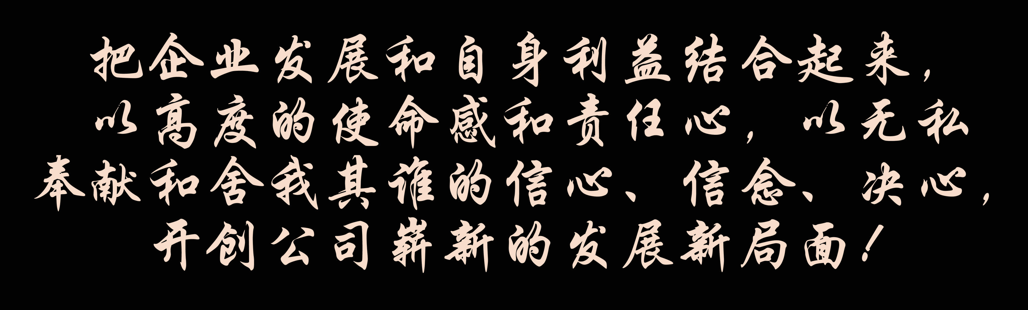 尤其是元、郝、路三位領導,你們的使命光榮,責任重大,公司能不能發展,能不能前進,全在你們肩上!不要只考慮個人利益和個人得失,不要把工作當成自己的權利范圍,要調動大家的積極性,主動性和創造性,學會正確組織和安排分管部門的工作,千斤重擔大家挑,分工合作,相互配合,相互促進!一個人的能力和精力是有限的,大家的精神和力量就是無限的,任何困難也難不倒壓不垮!
