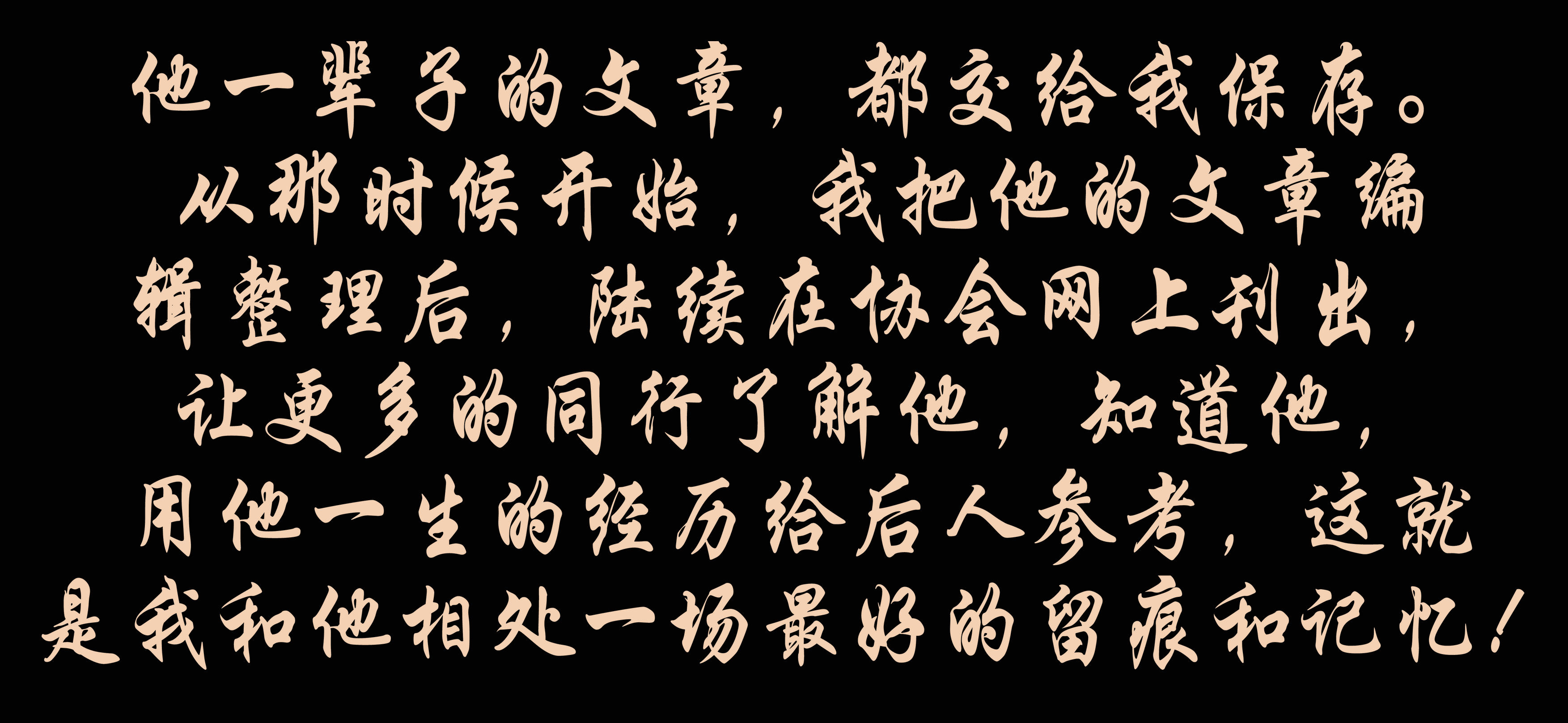 他一輩子的文章,都交給我保存。從那時(shí)候開始,我把他的文章編輯整理后,陸續(xù)在協(xié)會網(wǎng)上刊出,讓更多的同行了解他,知道他,用他一生的經(jīng)歷給后人參考,這就是我和他相處一場最好的留痕和記憶!