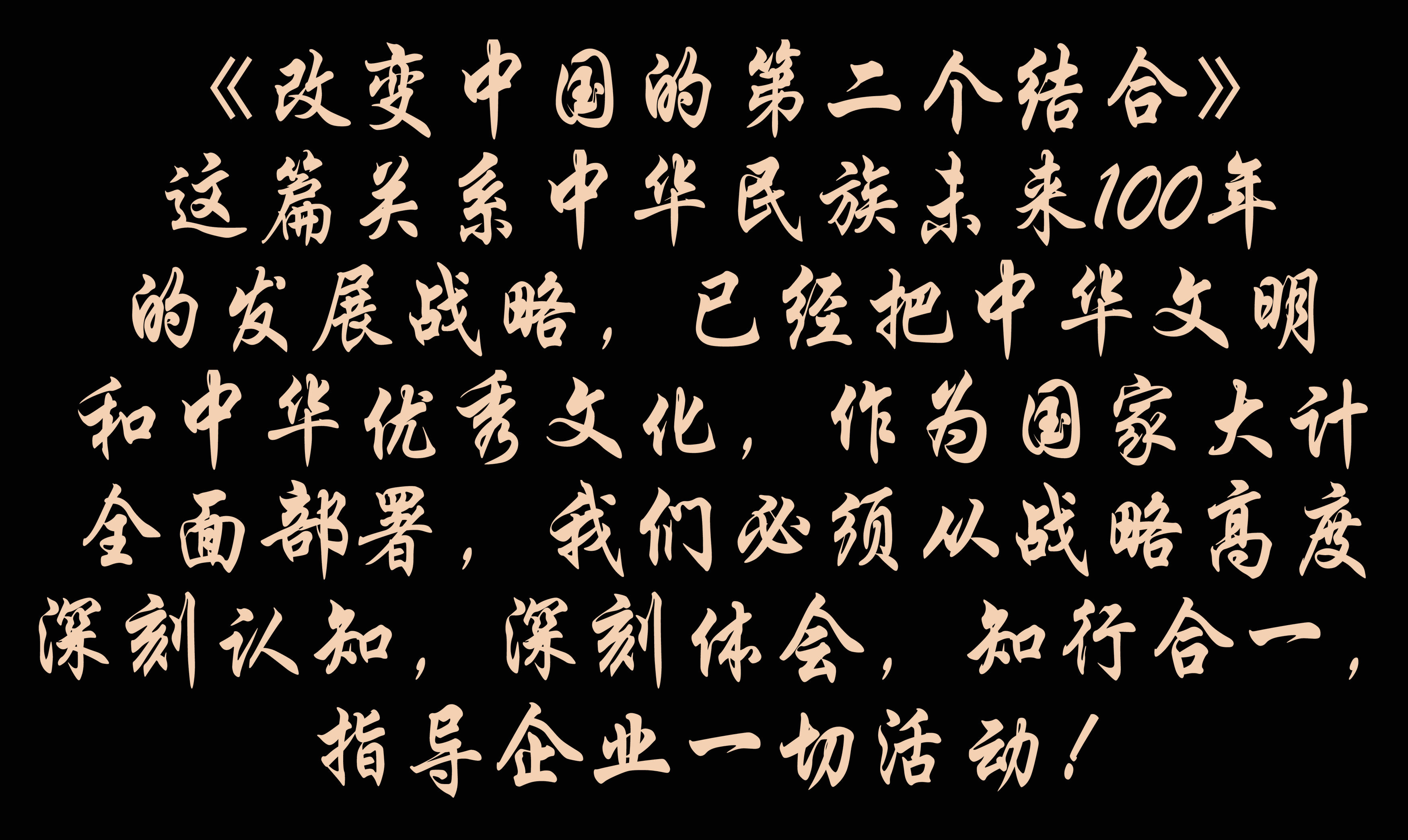 《改變中國的第二個結合》這篇關系中華民族未來100年的發展戰略,已經把中華文明和中華優秀文化,作為國家大計全面部署,我們必須從戰略高度深刻認知,深刻體會,知行合一,指導企業一切活動!