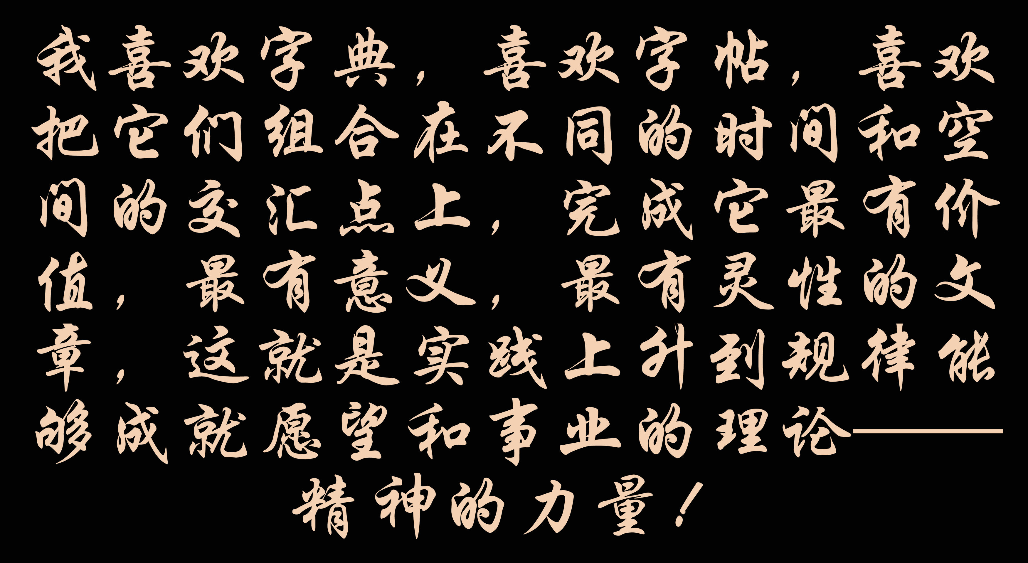 所以,我喜歡字典,喜歡字帖,喜歡把它們組合在不同的時間和空間的交匯點上,完成它最有價值,最有意義,最有靈性的文章,這就是實踐上升到規律能夠成就愿望和事業的理論——精神的力量!