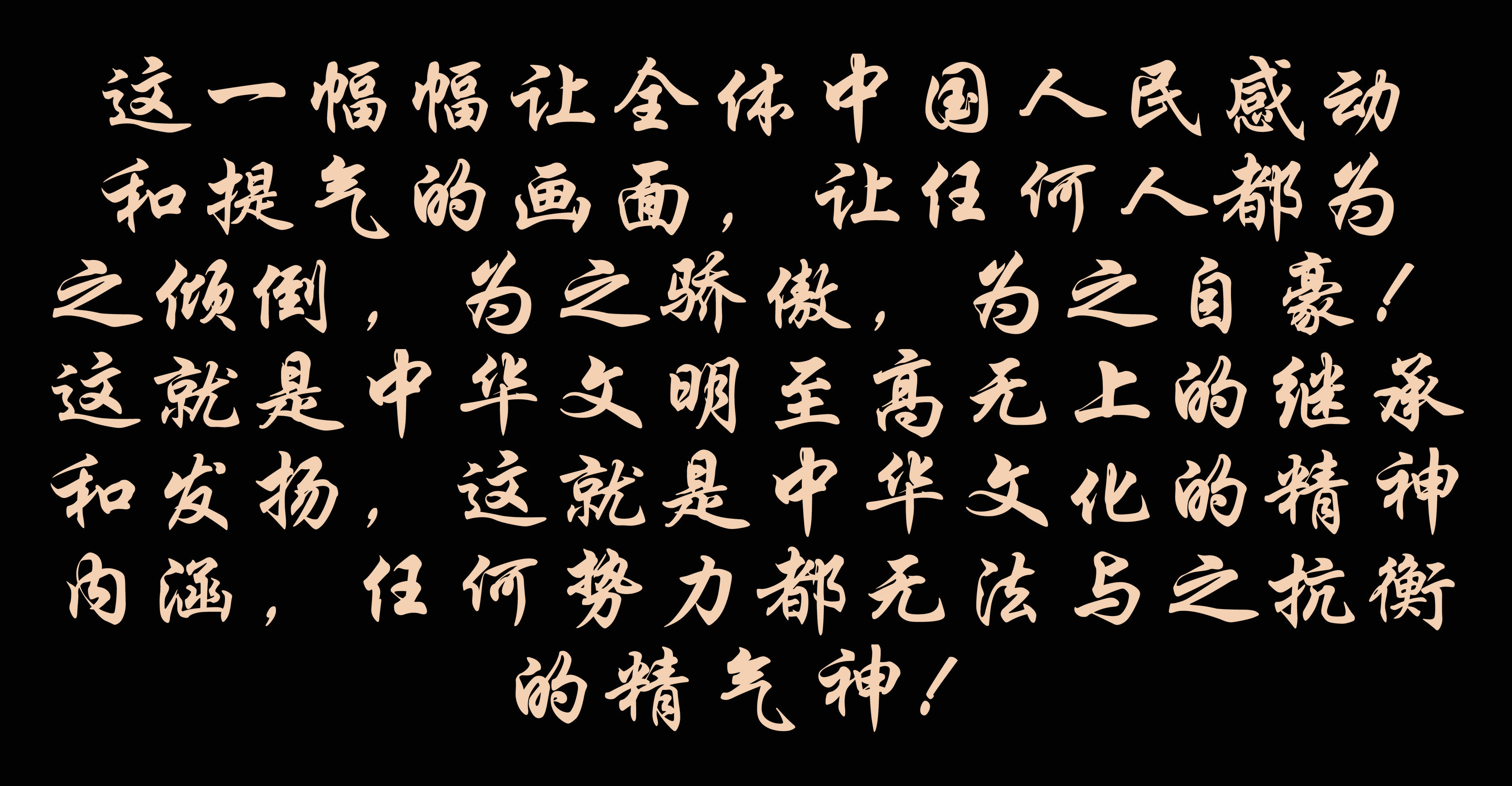 這一幅幅讓全體中國人民感動和提氣的畫面,讓任何人都為之傾倒,為之驕傲,為之自豪!這就是中華文明至高無上的繼承和發揚,這就是中華文化的精神內涵,任何勢力都無法與之抗衡的精氣神!