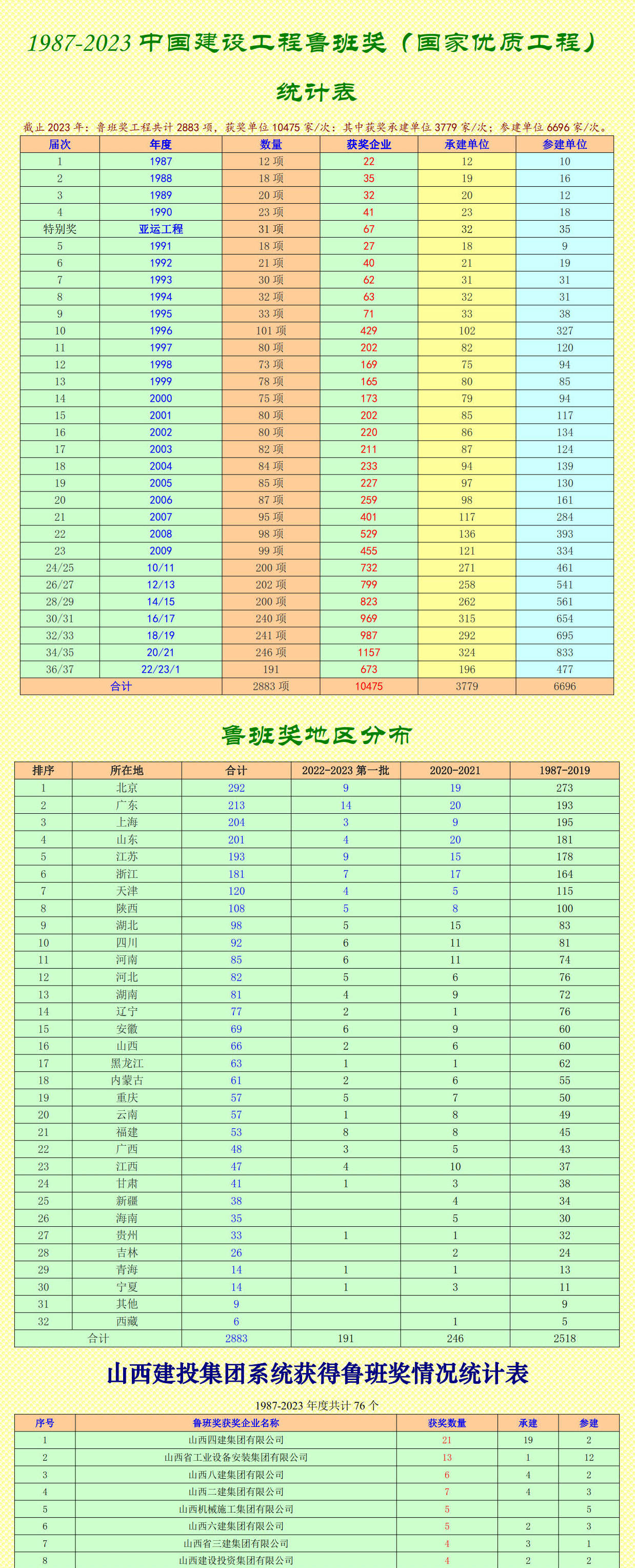 截止2023年:魯班獎工程共計2883項,獲獎單位10475家/次:其中獲獎承建單位3779家/次;參建單位6696家/次。