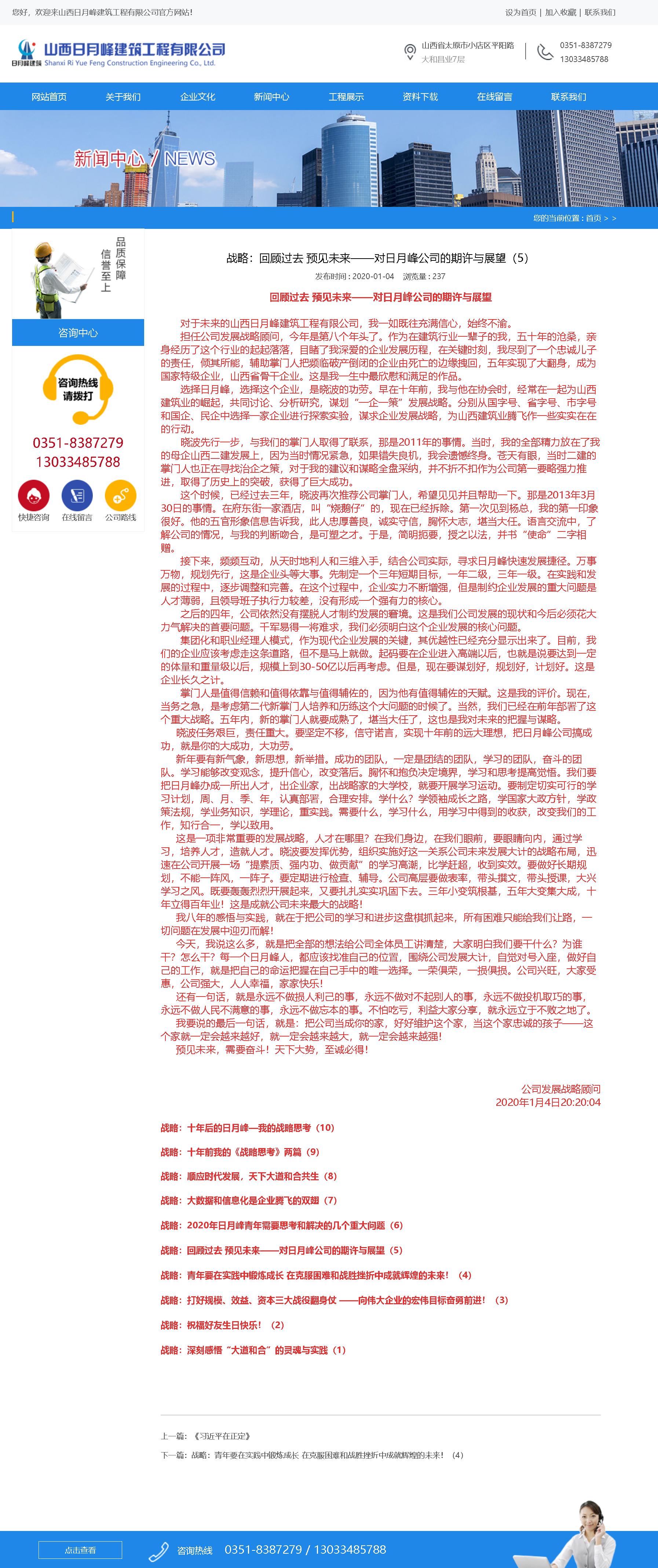 擔任公司發展戰略顧問,今年是第八個年頭了。作為在建筑行業一輩子的我,五十年的滄桑,親身經歷了這個行業的起起落落,目睹了我深愛的企業發展歷程,在關鍵時刻,我盡到了一個忠誠兒子的責任,傾其所能,輔助掌門人把頻臨破產倒閉的企業由死亡的邊緣拽回,五年實現了大翻身,成為國家特級企業,山西省骨干企業。這是我一生中最欣慰和滿足的作品。