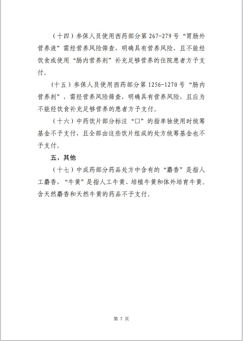 (十七)中成藥部分藥品處方中含有的“麝香”是指人工麝香,“牛黃”是指人工牛黃、培植牛黃和體外培育牛黃。含天然麝香和天然牛黃的藥品不予支付。