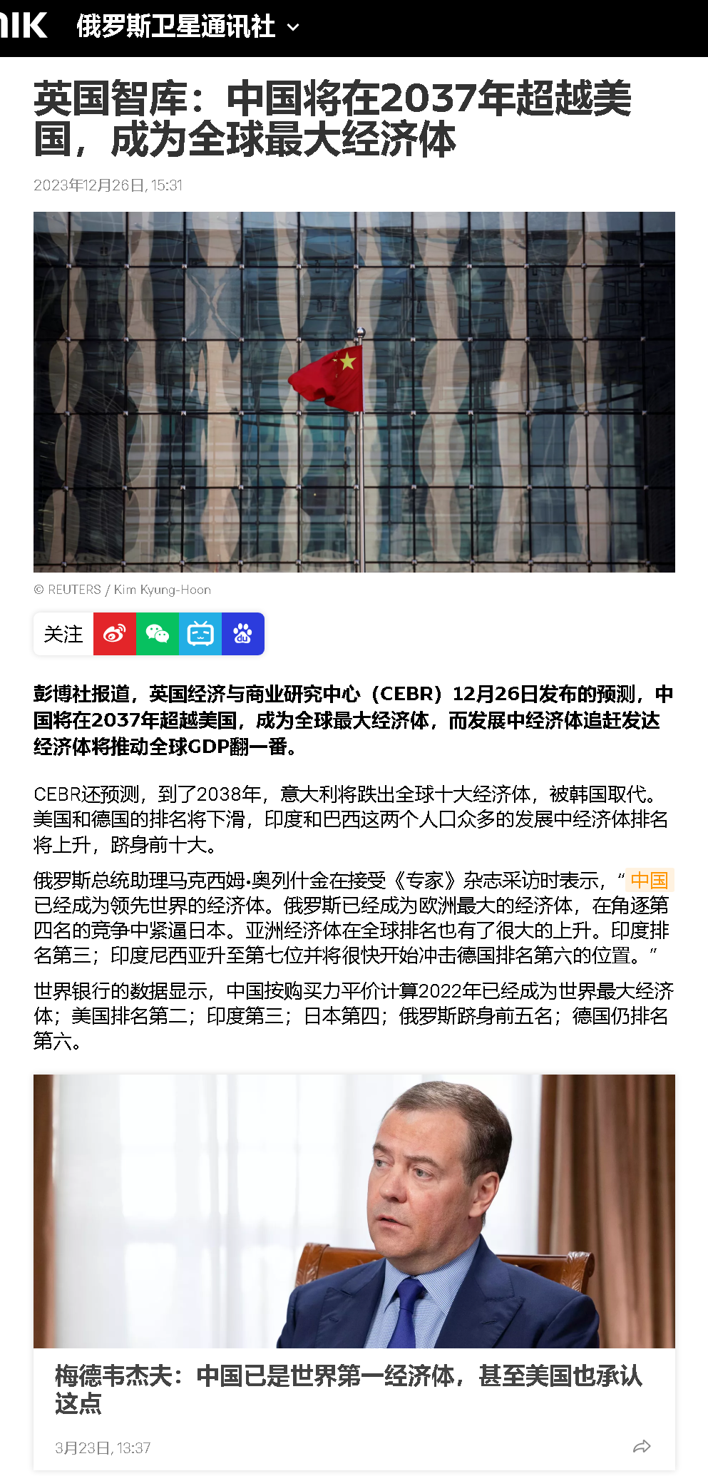 俄羅斯總統顧問馬克西姆·奧列什金在接受媒體采訪時表示:“中國已經成為領先世界的經濟體。俄羅斯已經成為歐洲最大的經濟體,在角逐全球第四名的競爭中緊逼日本。亞洲經濟體在全球的排名也有了很大的上升。印度排名第三;印度尼西亞升至第七位并將很快開始沖擊德國排名第六的位置。”