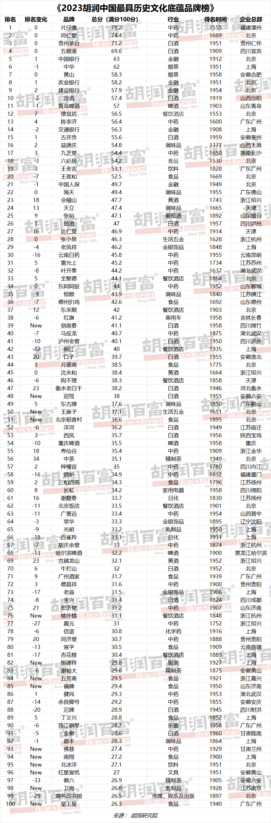 胡潤研究院發布《2023胡潤中國最具歷史文化底蘊品牌榜》