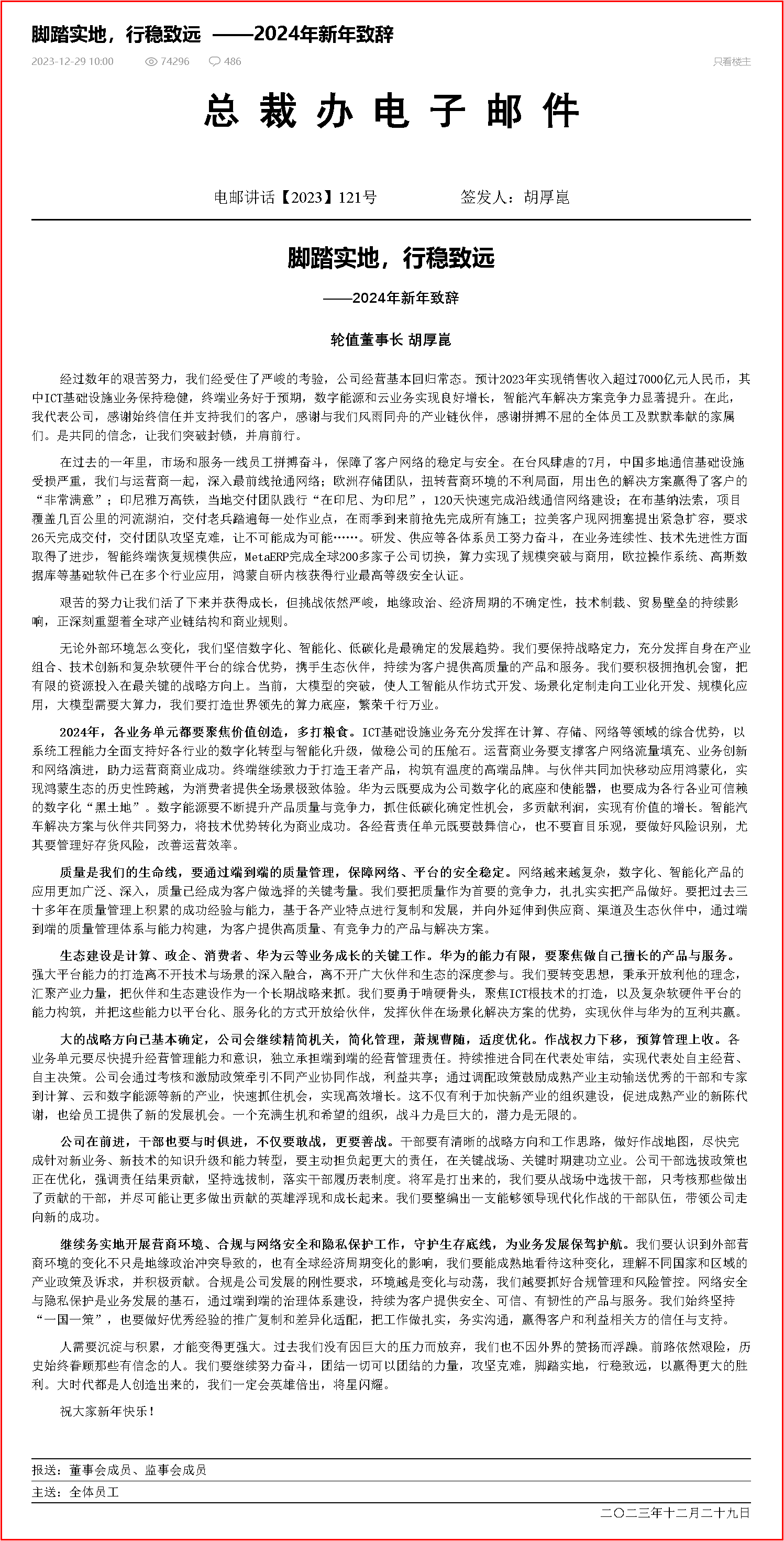 經過數年的艱苦努力,我們經受住了嚴峻的考驗,公司經營基本回歸常態。預計2023年實現銷售收入超過7000億元人民幣,其中ICT基礎設施業務保持穩健,終端業務好于預期,數字能源和云業務實現良好增長,智能汽車解決方案競爭力顯著提升。在此,我代表公司,感謝始終信任并支持我們的客戶,感謝與我們風雨同舟的產業鏈伙伴,感謝拼搏不屈的全體員工及默默奉獻的家屬們。是共同的信念,讓我們突破封鎖,并肩前行。