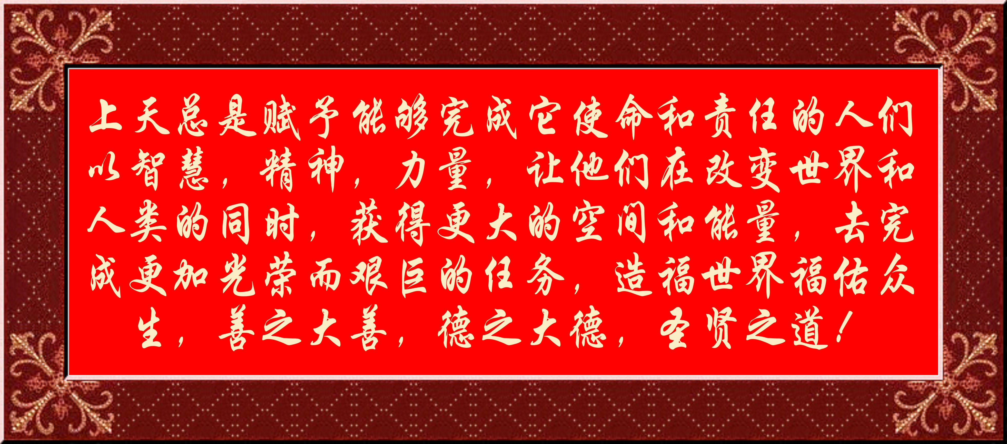上天總是賦予能夠完成它使命和責(zé)任的人們以智慧,精神,力量,讓他們?cè)诟淖兪澜绾腿祟惖耐瑫r(shí),獲得更大的空間和能量,去完成更加光榮而艱巨的任務(wù),造福世界福佑眾生,善之大善,德之大德,圣賢之道!