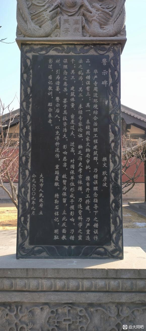 碑文主要內(nèi)容為:華嚴(yán)寺周邊環(huán)境綜合治理工程建筑群,乃錯(cuò)誤理念指導(dǎo)下之錯(cuò)誤作品。其錯(cuò)誤有三:其一,未經(jīng)國(guó)家文物局審批,擅自開工修建,乃嚴(yán)重違法之亂為;其二,未經(jīng)專家論證,缺乏歷史考古依據(jù),乃違背科學(xué)之蠻干;其三,建筑體量、密度過(guò)大、過(guò)高,對(duì)國(guó)保單位形成干預(yù)影響,乃錯(cuò)誤理念之惡果。鑒于其投資浩大,影響惡劣,故暫為保留,立此反面教材,引為借鑒,警示后人,以免謬種流傳,重蹈覆轍。特勒石銘記,明恥彰過(guò),痛記敬訓(xùn),昭示來(lái)者。