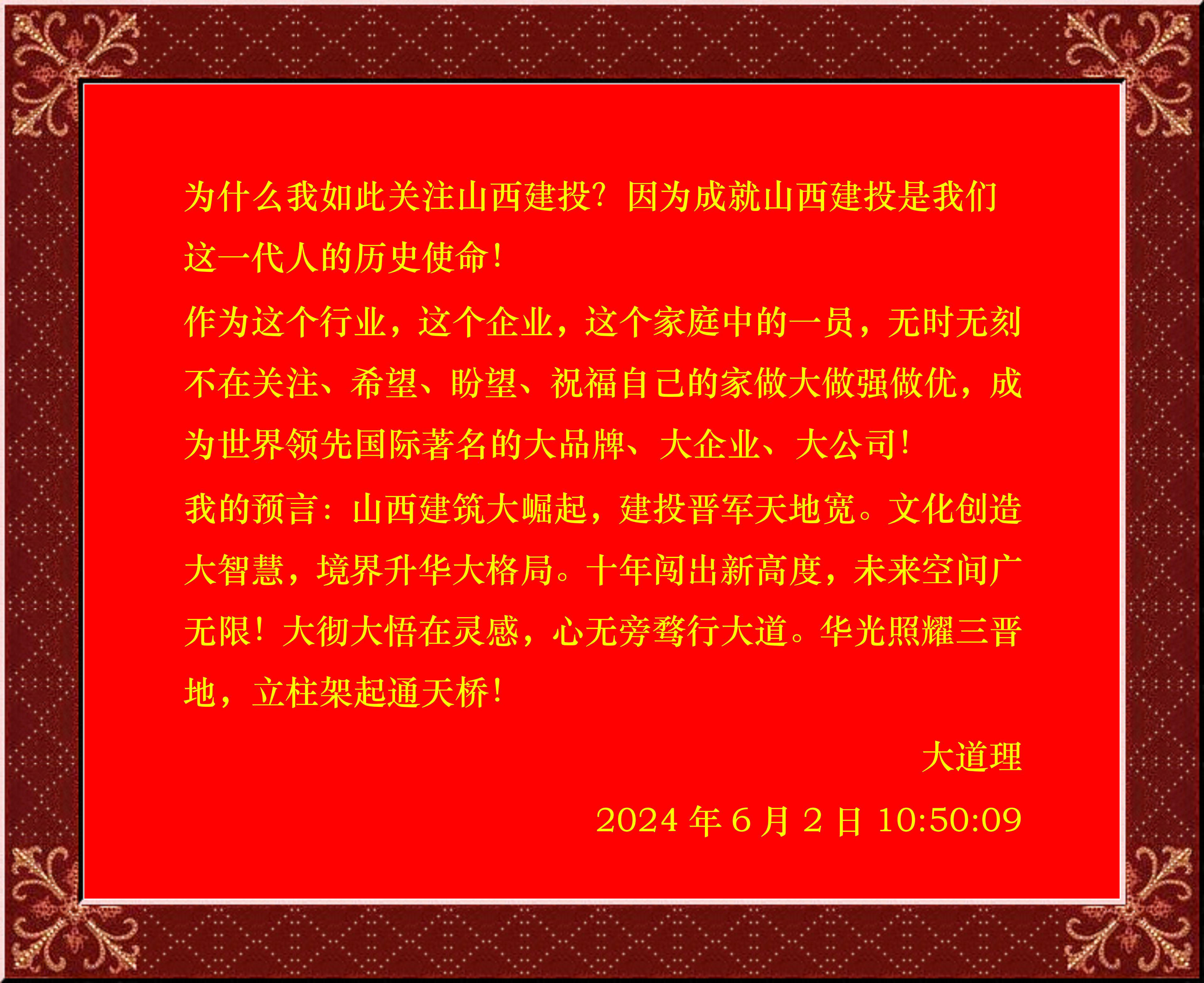 我的預言:山西建筑大崛起,建投晉軍天地寬。文化創造大智慧,境界升華大格局。十年闖出新高度,未來空間廣無限!大徹大悟在靈感,心無旁騖行大道。華光照耀三晉地,立柱架起通天橋!