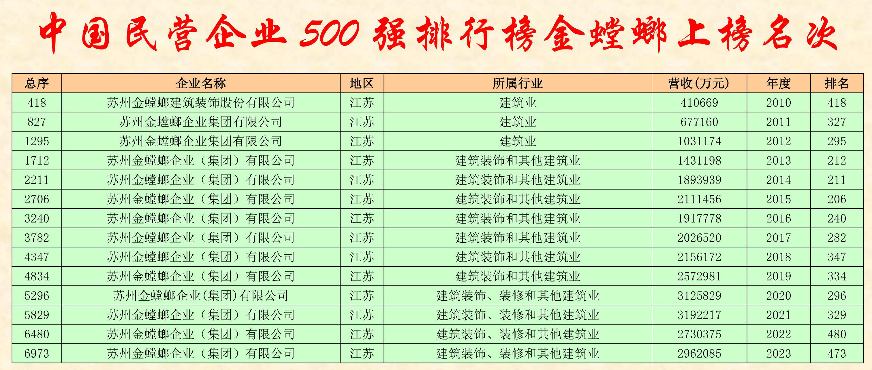 1 蘇州金螳螂建筑裝飾股份有限公司 江蘇 建筑業 410669 2010 418