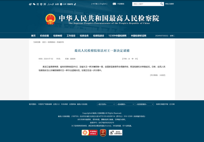 新華社北京7月2日電 記者2日從最高人民檢察院獲悉,黑龍江省委原常委,省政府原黨組副書記、副省長王一新涉嫌受賄一案,由國家監(jiān)察委員會調查終結,移送檢察機關審查起訴。日前,最高人民檢察院依法以涉嫌受賄罪對王一新作出逮捕決定。該案正在進一步辦理中。